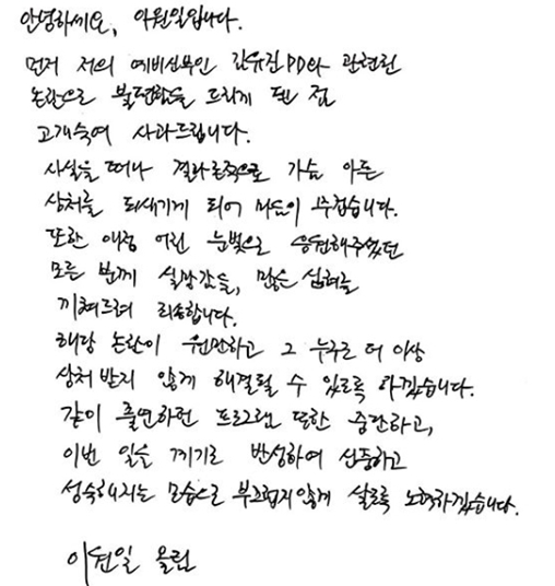 "이원일 셰프가 하지 않은 일로 자필 사과문을 올릴 때, 내 마음은 부모님과 예비 시부모님께 죄스러운 마음을 억누른 채 한 글자씩 자필 사과문을 올렸고 억울한 마음을 억누르고 있을 때는 죽고 싶은 심정이었다"