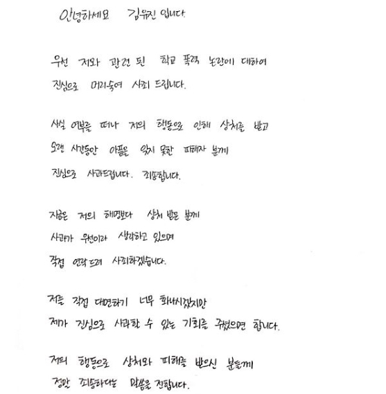 또한 방송에 나온 공인이라는 이유만으로 자필 사과문을 올렸는데, 이게 오히려 학폭을 인정한 꼴이 돼버렸으니 정말 안타깝다는 생각이 듭니다.