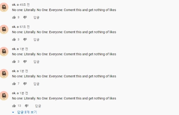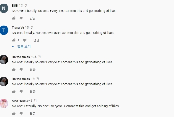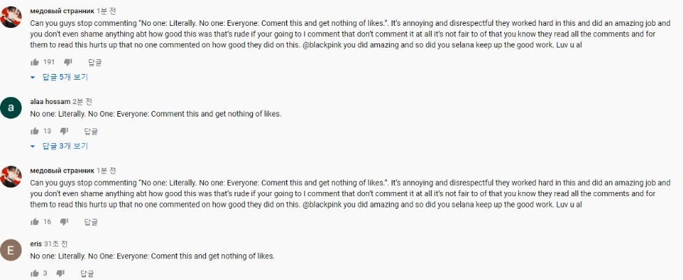 해당 내용을 한국어로 해석하면 "아무도: 진짜 아무도: 모두: 이 댓글을 달고 좋아요를 얻지 못한다"라는 뜻으로 해석되는데요. 이때문에 블랙핑크의 'Ice Cream' 뮤직비디오를 보러왔던 팬들은 이 상황이 몹시 짜증나고 화가 났을 것입니다.