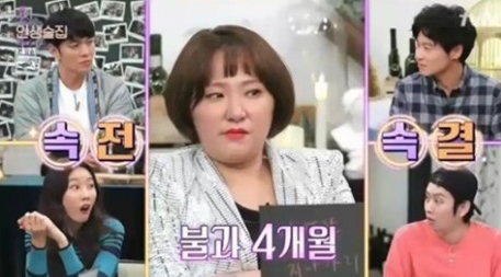 "오래 만난 남자랑 헤어지고 실의에 빠졌을 때 뮤지컬을 했다. 그 때 같은 뮤지컬에 출연하던 언니가 지인을 불렀는데 (남편이) 그 남동생이었다. 처음 만났는데 부산 남자답게 '여기, 앉으세요' 하더라. 2차로 꽃게집을 갔는데 꽃게를 까서 먹으라고 줬다. 3차로는 노래방을 갔는데 '뭐 이렇게 무거워 보이노?' 하더니 가방을 들어주더라. 그러고 나서 눈을 떴는데 뽀뽀를 하고 있더라."