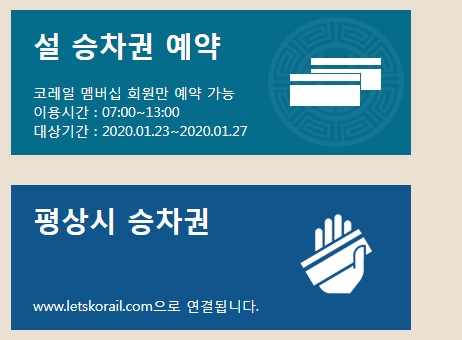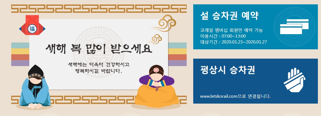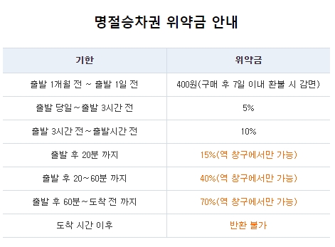 그리고 이번 설 기차표 예매 대상은 23일부터 27일까지 운행하는 KTX, KTX-산천, ITX-청춘, ITX-새마을, 새마을호, 무궁화호, 누리로 등 일반 열차와 O.V.S.DMZ-트레인 등 관광전용열차의 승차권이니 날짜 꼭 숙지해주세요. 그리고 예매 후 구매 철회시 날짜에 따라 위약금이 최대 70%까지 나올 수 있으니 주의 하시길 바랍니다. 그외에 다른 날짜 기차표는 따로 마련된 레츠코레일 홈페이지에서 구입할 수 있습니다.
