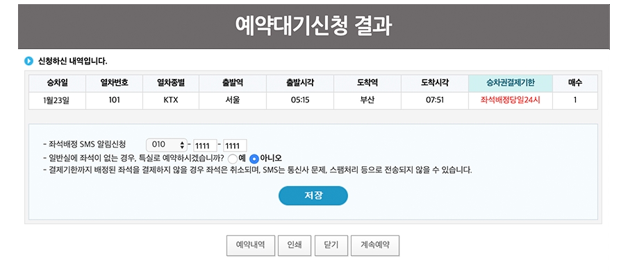 다음 예약대기신청 결과 화면입니다. 자리가 나는대로 예약순서가 부여됩니다.