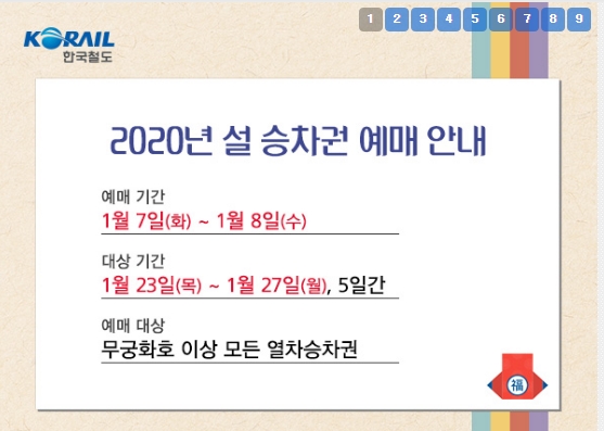 ktx 레츠코레일 홈페이지에서는 7일 오전 7시부터 오후 3시까지 예매가 가능하며, 지정된 역과 승차권 판매 대리점에서는 오전 8시부터 11시까지 예매할 수 있습니다. 단 승차권 앱 '코레일 톡'에서는 예매할 수 없으니 이점 유의하세요.