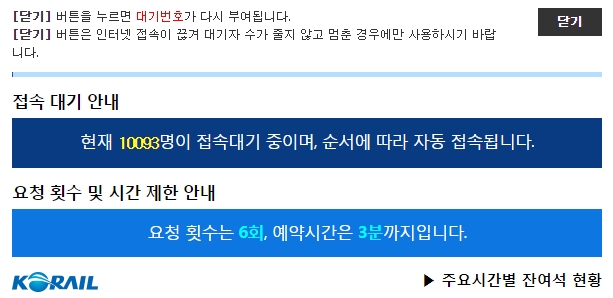 대기순을 기다려 ktx 레츠코레일 설기차표 예매 사이트에 접속하면 준비해둔 아이디와 패스워드로 로그인을 하세요. 각 코레일 회원마다 예약 요청 횟수는 6회이며 구입은 3분이내에 하셔야 하니 가실 날짜와 시간을 미리 정해두고 예약하는 것이 좋습니다.