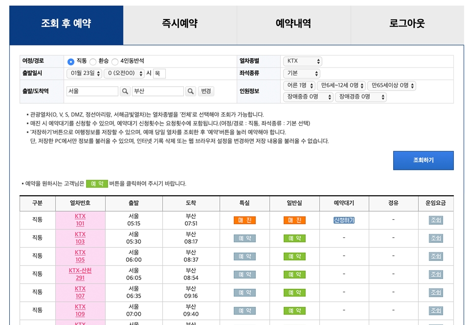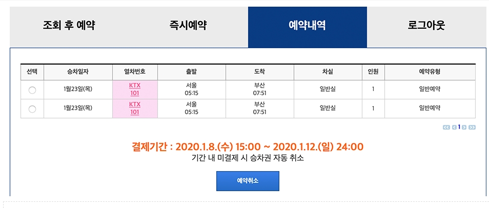다음은 즉시예약 화면입니다. 원하는 날짜의 시간때의 기차표가 있다면 즉시 예약이 완료 됩니다.