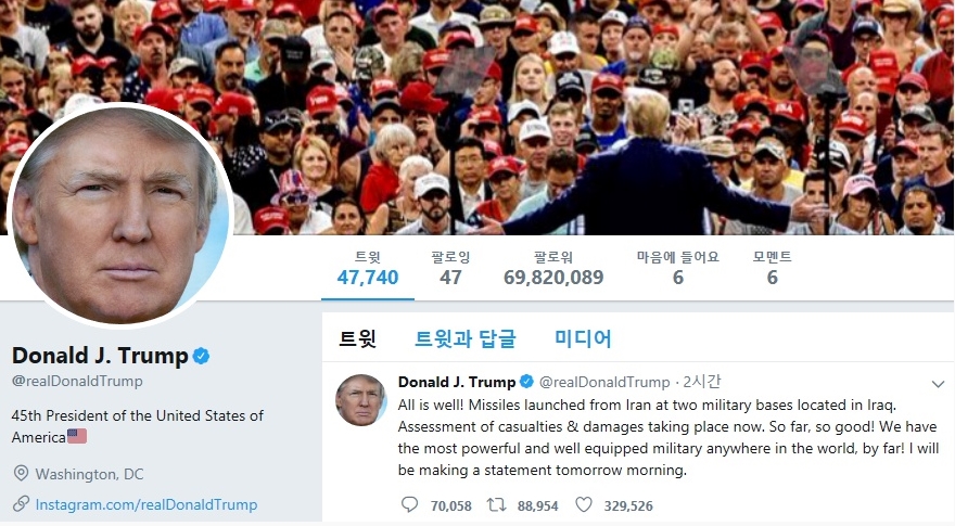 트럼프 대통령은 트위터에서 "모두 괜찮다"라고 발언했습니다. 또한 트럼프 대통령은 미사일이 발사된 당일 대국민성명을 준비했다가 이를 다음날 아침으로 미루며 긴급 사태가 아님을 드러내기도 했죠. 이는 결과적으로 이란이 주장하는 만큼 미군 측에 큰 피해가 없었다는 것을 반증합니다.