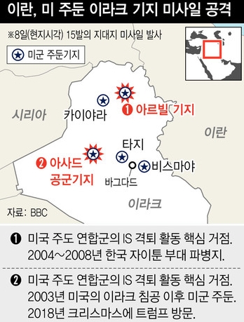 미국 중부사령부의 발표에 따르면 15발 가운데 10발이 알아사드 공군기지에, 1발이 에르빌 기지에 각각 명중했고 나머지 4발은 불발됐다고 합니다. 이는 이란 국영방송이 미사일 15발을 이라크 내 '미국 목표물'을 모두 타격했다는 보도와는 완전히 다른 결과죠.