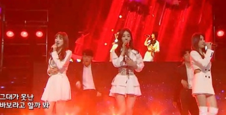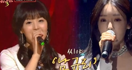 장막 뒤에는 걸그룹 몸매를 갖고 있는 3인조 여성이 그림자로 등장했고, 무대 위로 멤버 한명 한명씩 올라오며 얼굴을 공개했는데 바로 남규리를 포함한 3인조 여성 그룹 '씨야'였죠.