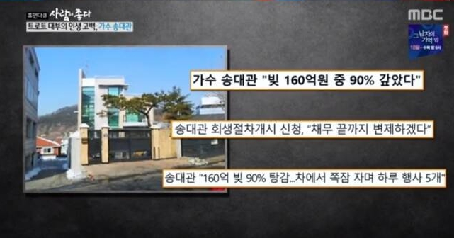 그렇게 휴먼다큐 사람이좋다에 출연한 송대관은 빚을 어느 정도 갚은 후 집부터 장만을 했다고 밝혔습니다. 월세살이에 대한 불편함 때문이 아니라, 늦은 나이에 집 한 채는 가지고 있어야 안정감이 들었기 때문이라고 하네요.