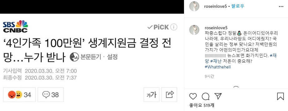 특히 장미인애 비판은 정부가 소득 하위 70% 4인 가구에게 100만원씩 생계지원금을 지급하기로 한 소식에 대해 "짜증스럽다, 정말"이라는 말로 문재인 정권을 비판했습니다.
