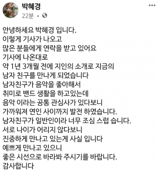 다음은 남자친구와 열애 및 결혼에 대한 공식입장을 전한 박혜경 인스타그램 글이다.
