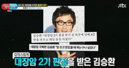 그런데 배우 김승환에게 진짜 악몽은 따로 있었습니다. 폐인 같은 생활을 이어 나가던 중 건강에 이상이 왔고 2005년 대장 내시경을 하게 되는데 이때 종양이 발견되어 대장암 2기 판정을 받게 된 것입니다.