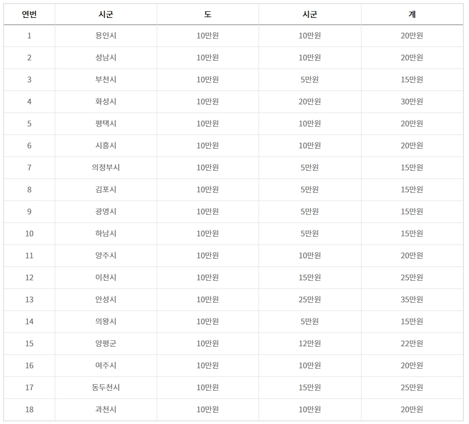 즉 경기도와 기준이 동일하고 조례와 예산편성절차를 완료한 18개 시군 주민은 경기도 재난기본소득뿐 아니라 시군에서 자체적으로 지급하는 재난기본소득도 함께 신청할 수 있습니다.