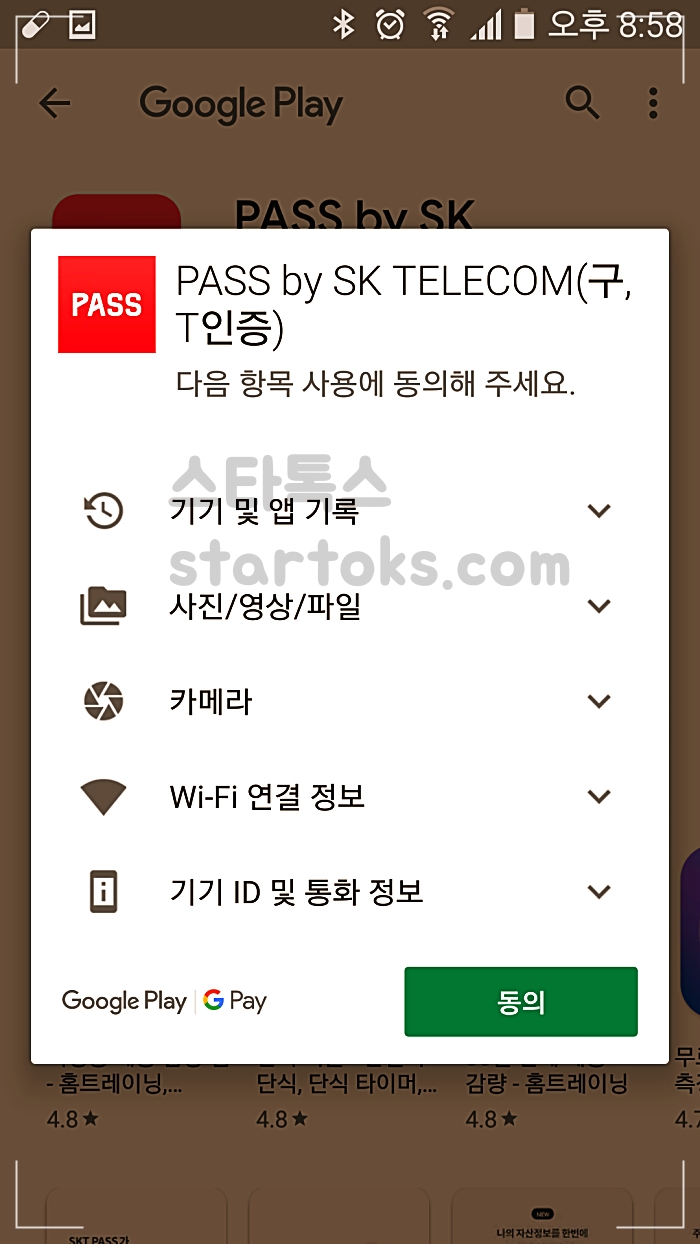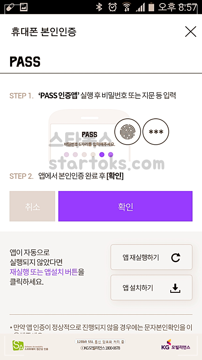 ▲휴대폰 인증 PASS어플 미설치 앱설치하기 버튼을 눌러 설치를 해줍니다.